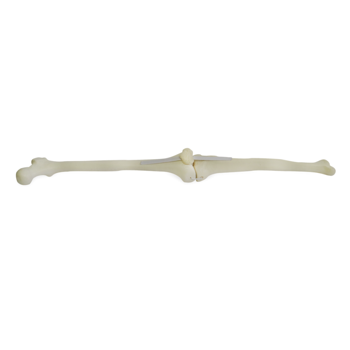 Com fêmur esquerdo, tíbia esquerda e patela, o conjunto apresenta camada cortical, osso esponjoso e canal medular, além de estar unido por simulação dos ligamentos colaterais (medial e lateral) e cruzados (anterior e posterior). Isso permite executar cortes, perfurações e fixações com instrumentais cirúrgicos reais, replicando a resistência.