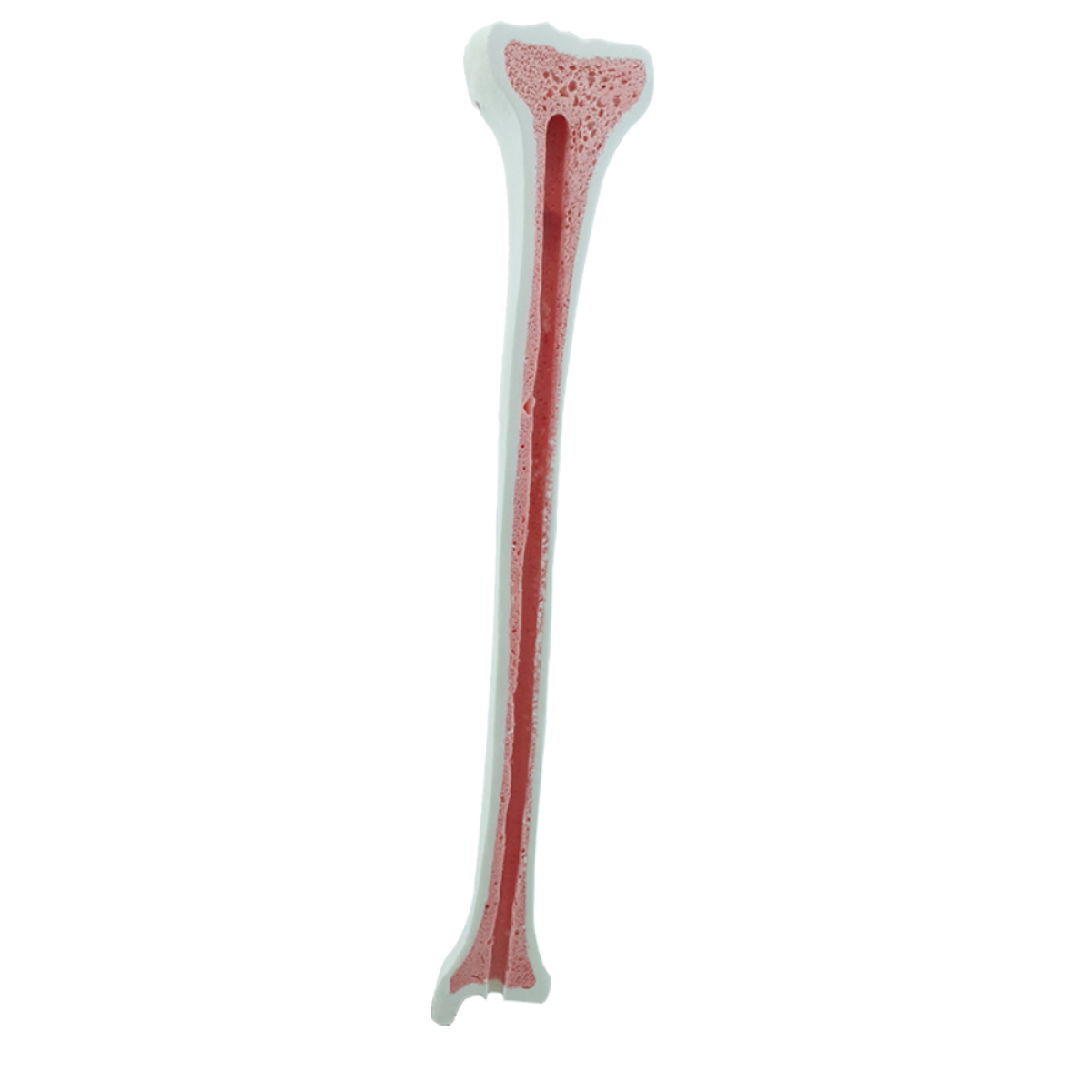 Com cortical + esponjoso + canal medular, o modelo entrega realismo tátil e mecânico muito próximo do osso humano, favorecendo planejamento cirúrgico e execução de passagens de parafuso, perfurações, cortes e montagem de sistemas de fixação.